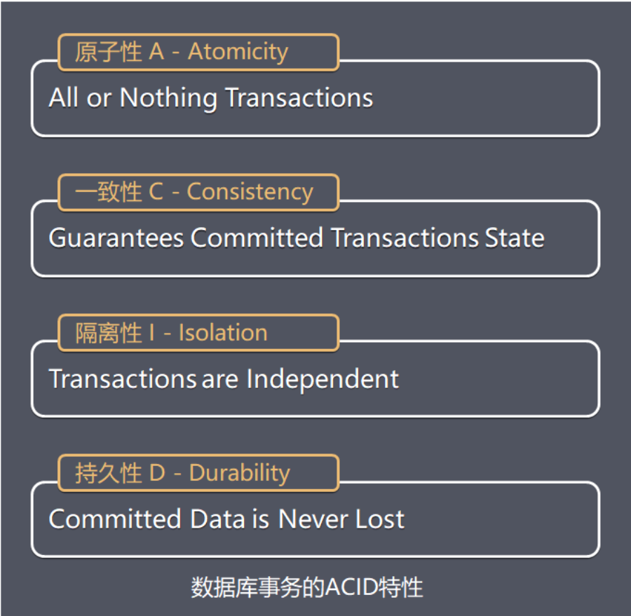 事务是基于数据进行操作,需要保证事务的数据通常存储在数据库中,所以介绍到事务,就不得不介绍数据库事务的ACID特性,指数据库事务正确执行的四个基本特性的缩写。包含: