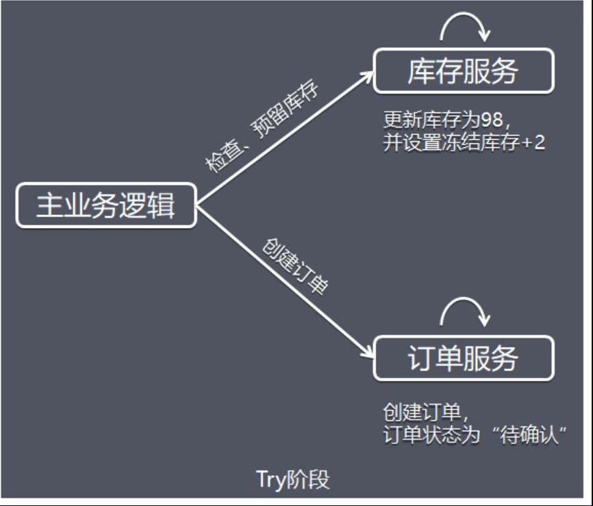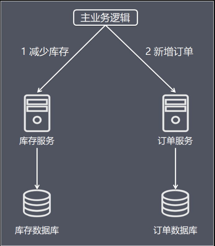 上图中包含了库存和订单两个独立的微服务,每个微服务维护了自己的数据库。在交易系统的业务逻辑中,一个商品在下单之前需要先调用库存服务,进行扣除库存,再调用订单服务,创建订单记录。