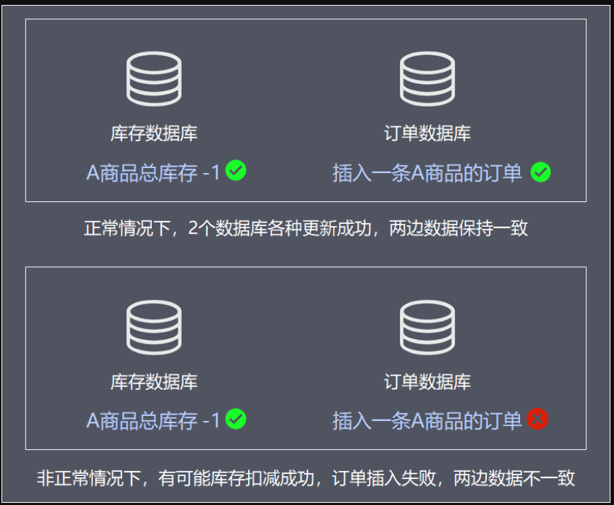 可以看到,如果多个数据库之间的数据更新没有保证事务,将会导致出现子系统数据不一致,业务出现问题。