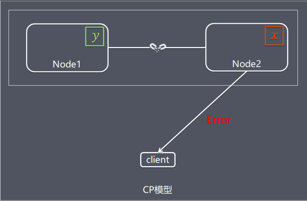 这时客户端C 访问 Node2 时,Node2 需要返回 Error,提示客户端 “系统现在发生了错误”,这种处理方式违 背了可用性(Availability)的要求,因此 CAP 三者只能满足 CP。