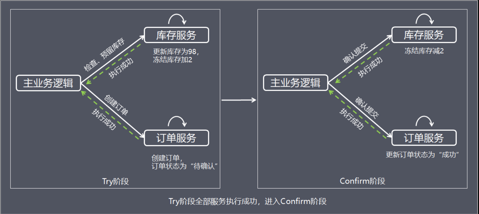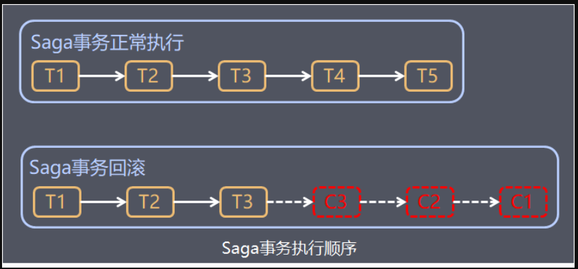 - 事务正常执行完成 T1, T2, T3, ..., Tn,例如:扣减库存(T1),创建订单(T2),支付(T3),依次有序完成整个事务。