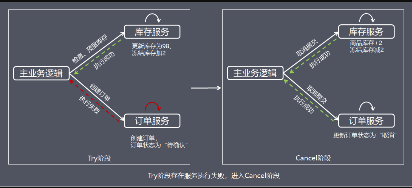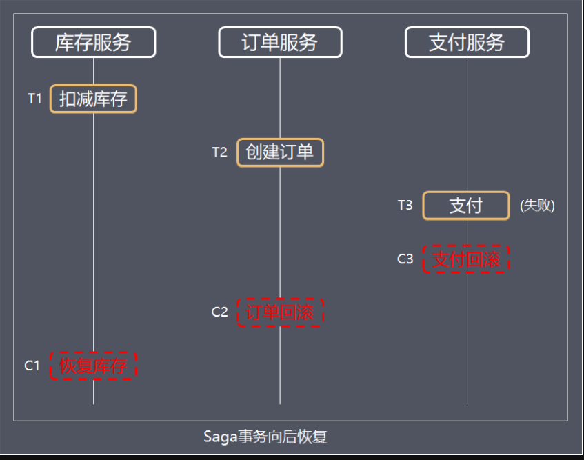 - 事务回滚 T1, T2, ..., Tj, Cj,..., C2, C1,其中0 < j < n,例如:扣减库存(T1),创建订单(T2),支付(T3,支付失败),支付回滚(C3),订单回滚(C2),恢复库存(C1)。