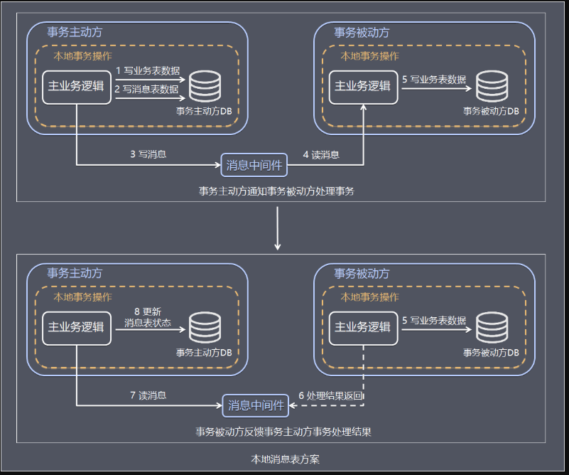 - 步骤3 事务被动方通过消息中间件,通知事务主动方事务已处理的消息。 上面例子中,订单服务把事务已处理消息写到消息中间件,库存服务消费中间件的消息,并将事务消息的状态更新为已完成(图中6 - 8)