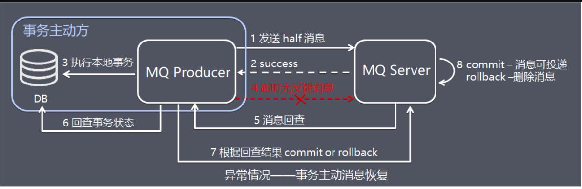- 图中6、发送方收到消息回查后,需要检查对应消息的本地事务执行的最终结果。