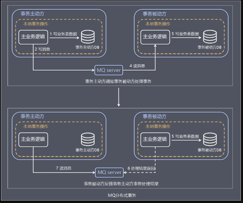 事务主动方基于MQ通信通知事务被动方处理事务,事务被动方基于MQ返回处理结果。 如果事务被动方消费消息异常,需要不断重试,业务处理逻辑需要保证幂等。 如果是事务被动方业务上的处理失败,可以通过MQ通知事务主动方进行补偿或者事务回滚。
