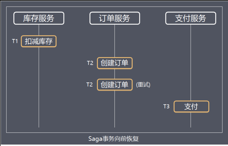 对应于上面第一种执行顺序,适用于必须要成功的场景,发生失败进行重试,执行顺序是类似于这样的:T1, T2, ..., Tj(失败), Tj(重试),..., Tn,其中j是发生错误的子事务(sub-transaction)。该情况下不需要Ci。