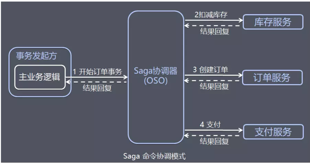 中央协调器(Orchestrator,简称OSO)以命令/回复的方式与每项服务进行通信,全权负责告诉每个参与者该做什么以及什么时候该做什么。