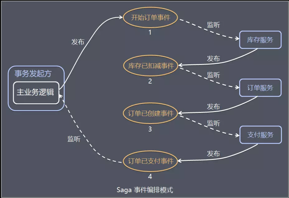 在事件编排方法中,第一个服务执行一个事务,然后发布一个事件。该事件被一个或多个服务进行监听,这些服务再执行本地事务并发布(或不发布)新的事件。